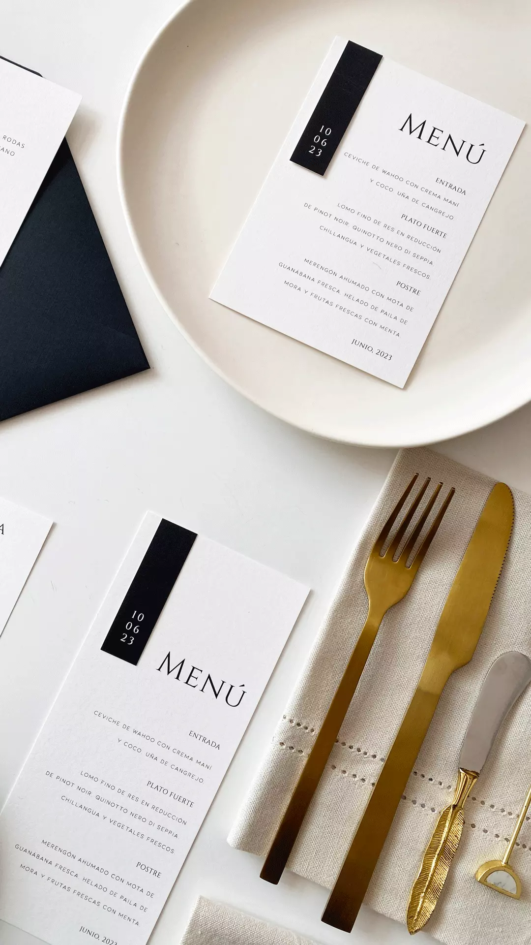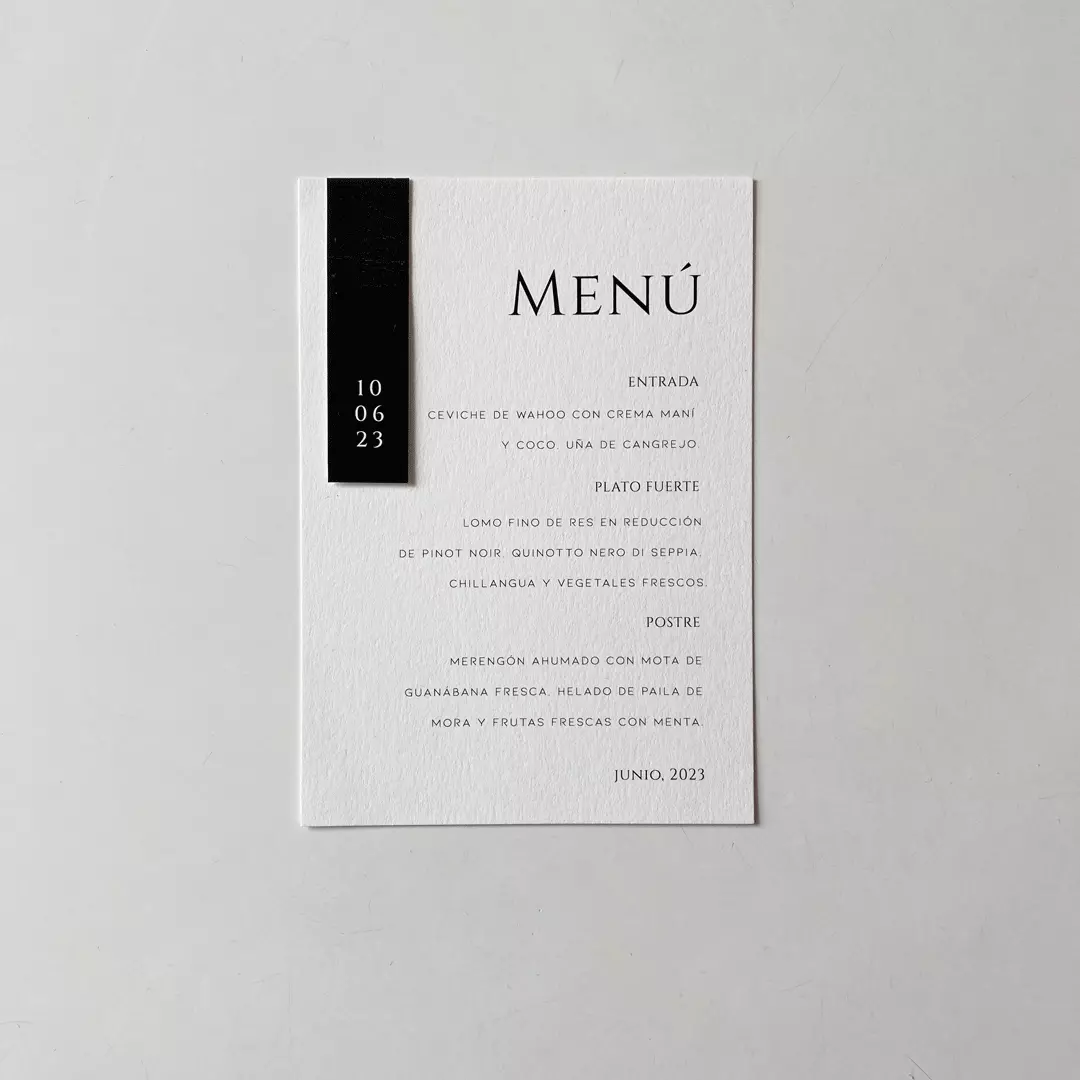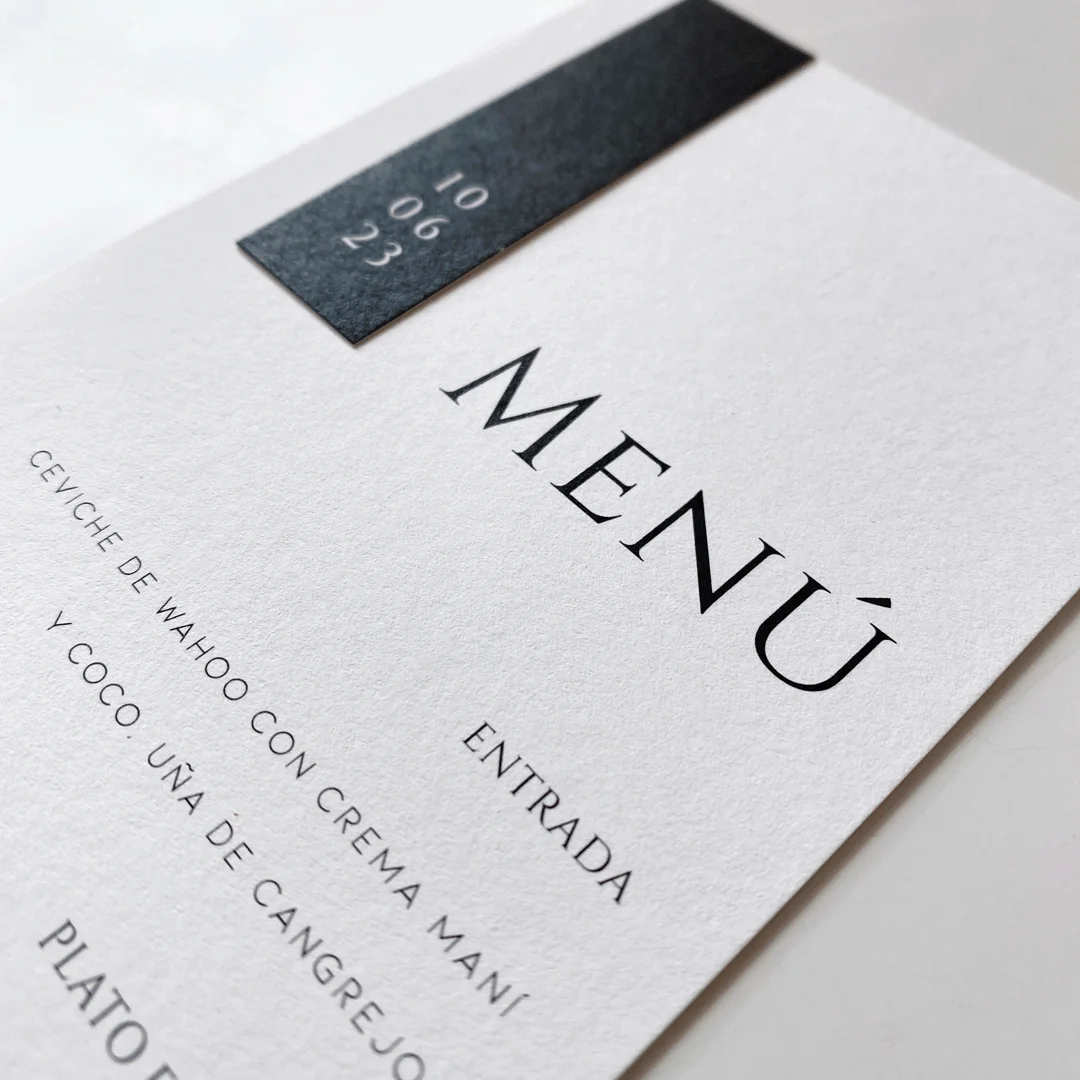 Eleva con personalidad y distinción las mesas de invitados con menús de diseño contemporáneo, materiales de lujo, elementos gráficos sencillos y sofisticados a la vez, tipografía elegante y moderna.