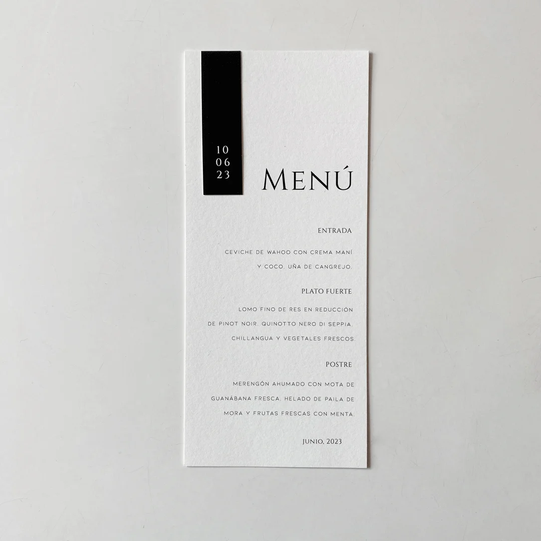 Incluye: Menú impreso a un lado y troquelado de 9×20 cm – Papel Premium, Italiano. de 250 gTag impreso – Epic Black / Negro 216 g Pedidos superiores a 75 unidades obtienen descuentos