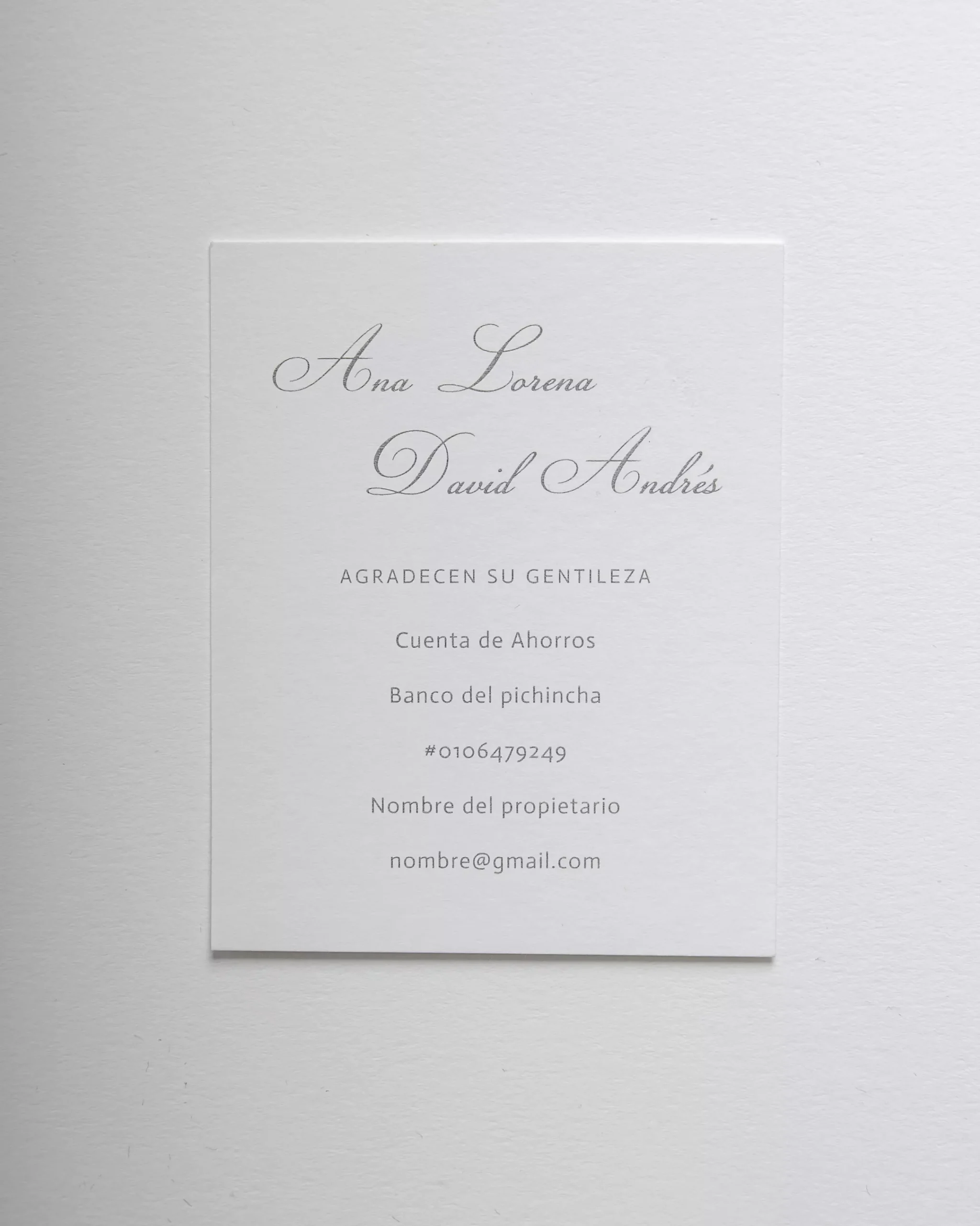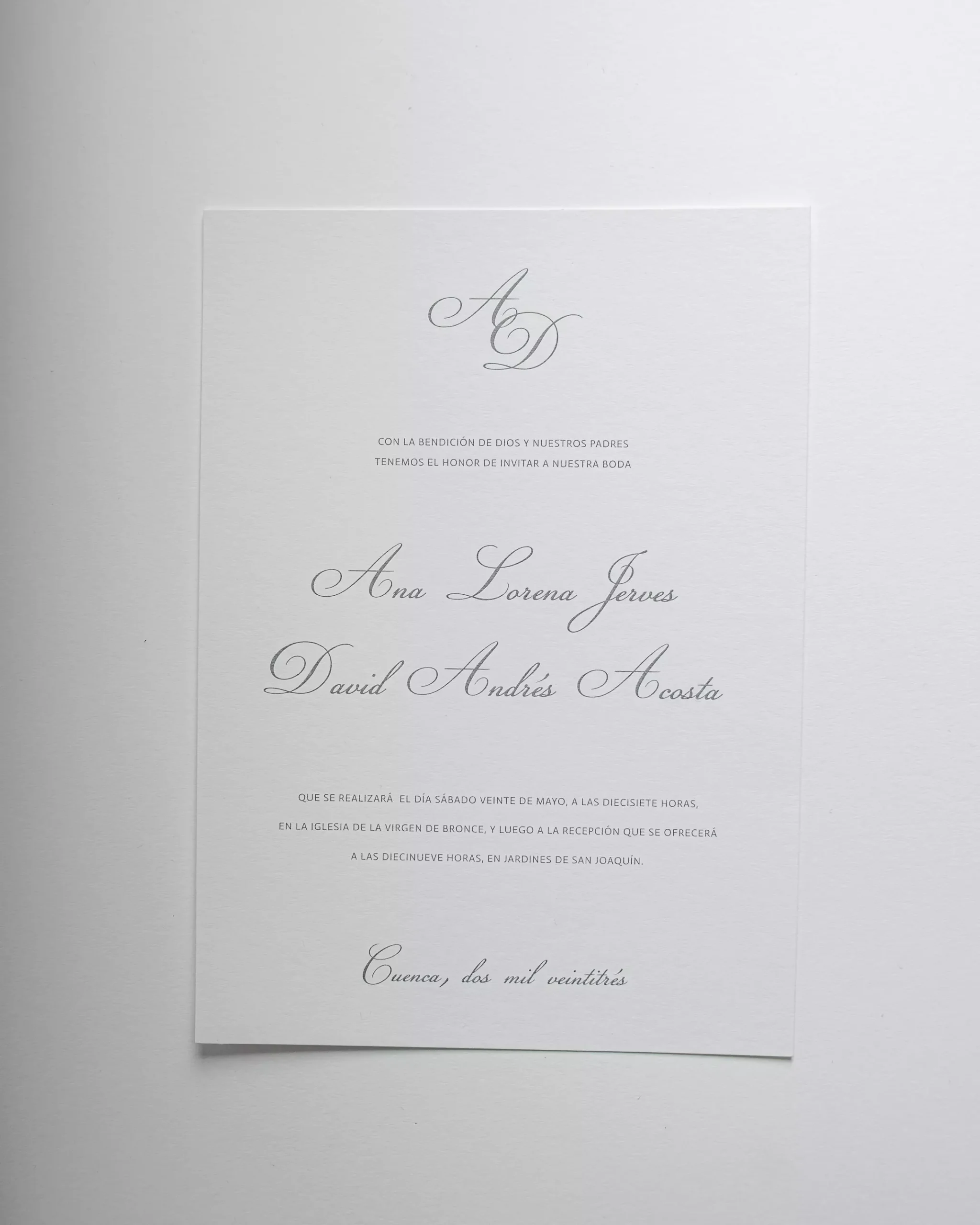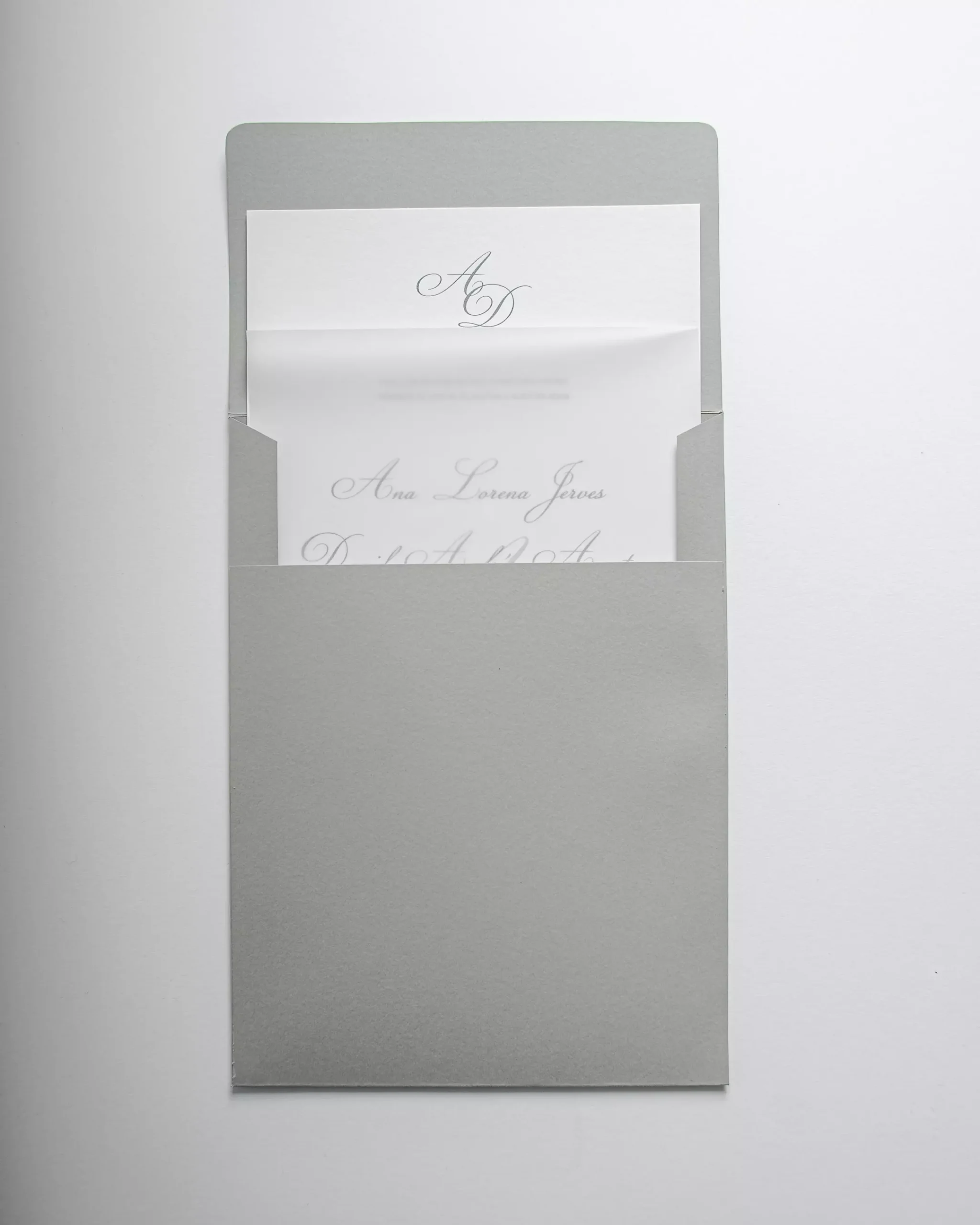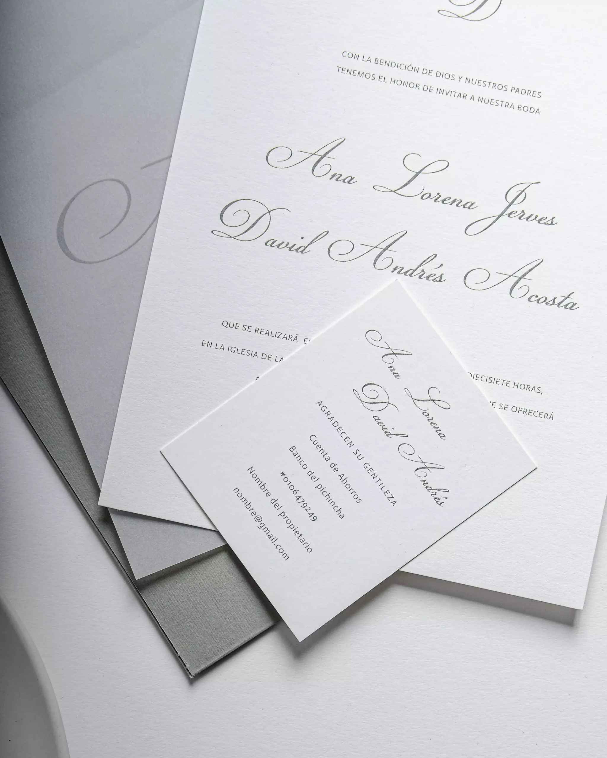 Incluye: Sobre Wide de 18,5 x 25.. – Marcatte Nettuno grigio de 215gr.Tarjeta de invitación de 17 x 23,5 cm. – Old mill bianco 350gr.Pergamino impreso.