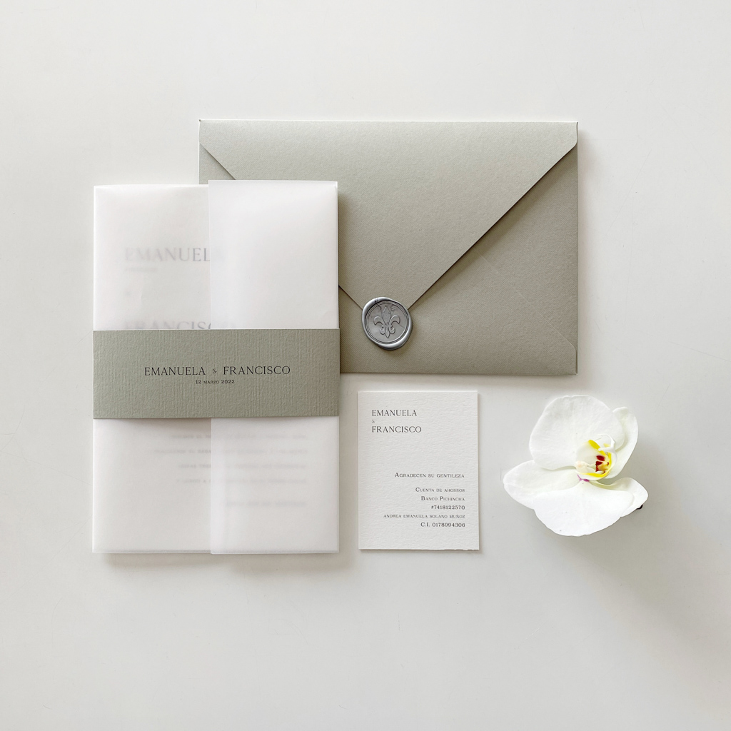 Las invitaciones de boda Bloom Sage Green, es una de las propuestas más solicitadas dentro de Hola Color. Su diseño elegante, sobrio y minimalista lo convierten en el candidato perfecto para bodas de lujo. Recuerda que puedes personalizar tus invitaciones de boda con un sello de lacre, también conocido como sello de cera, que combine con tu invitación.