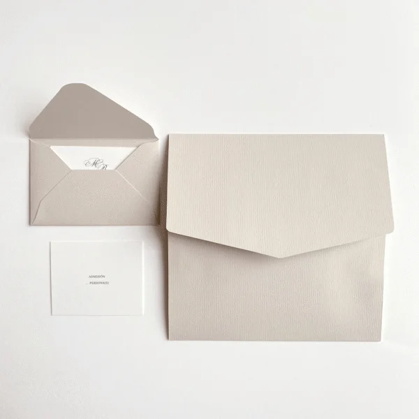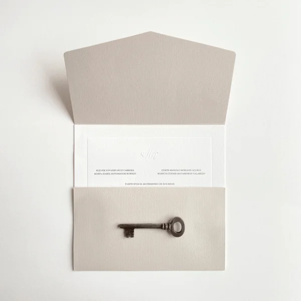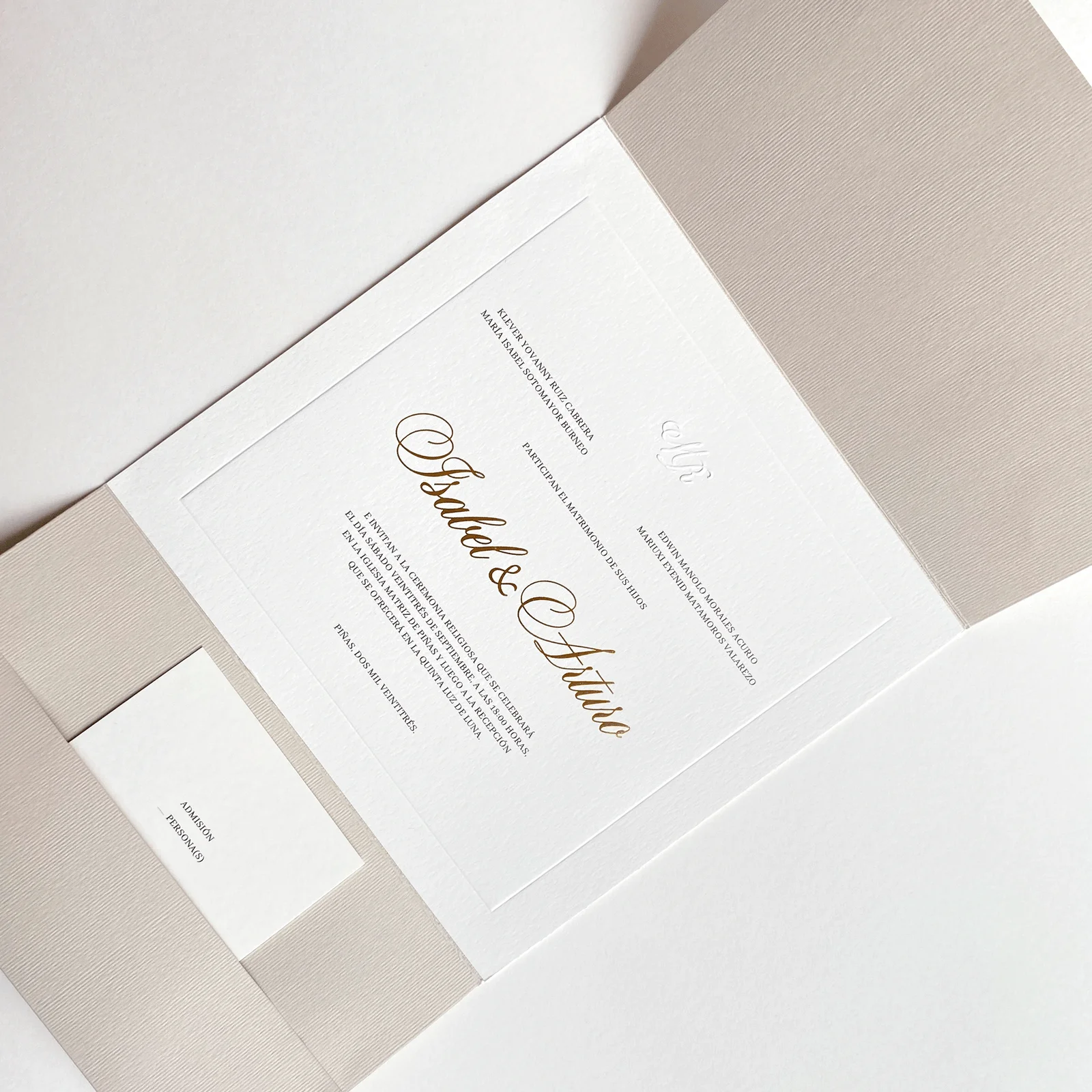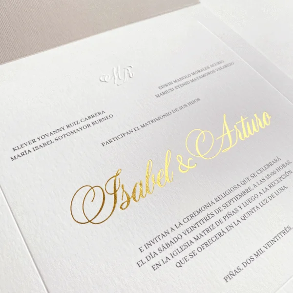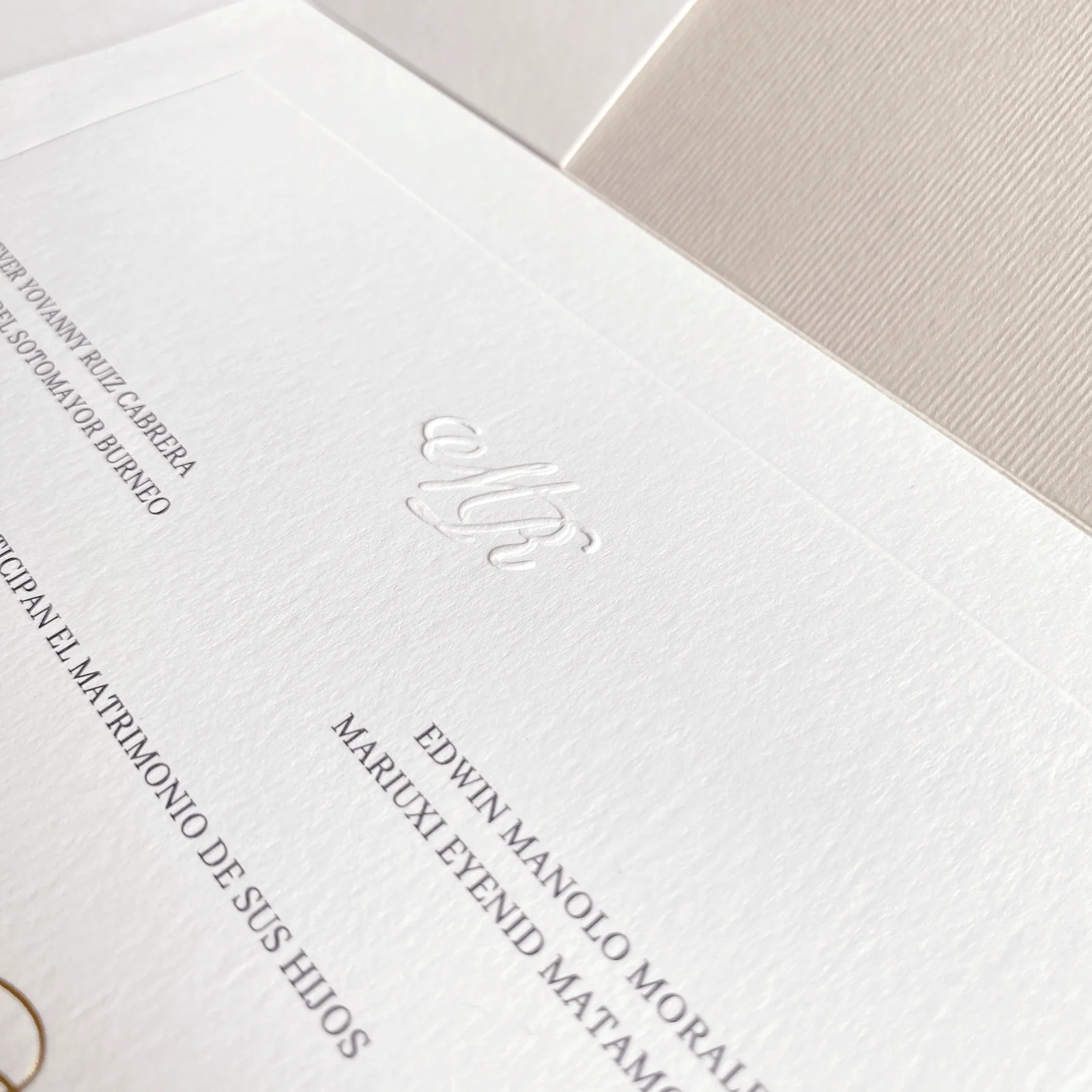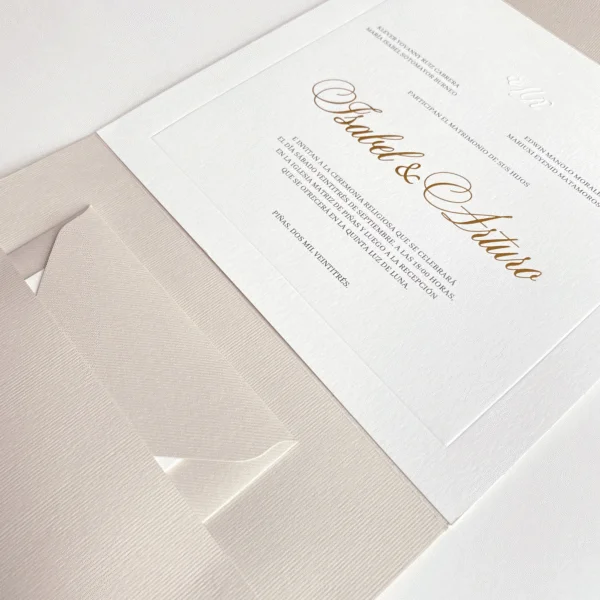 – Sobre tipo tríptico con bolsillo para accesorios impresos. 19x20 cm (cerrado) 42×20 cm (abierto)- Tarjeta de invitación principal con marco seco.- Tarjeta de agradecimiento.- Pan de Oro en nombre de novios.- Monograma en relieve.