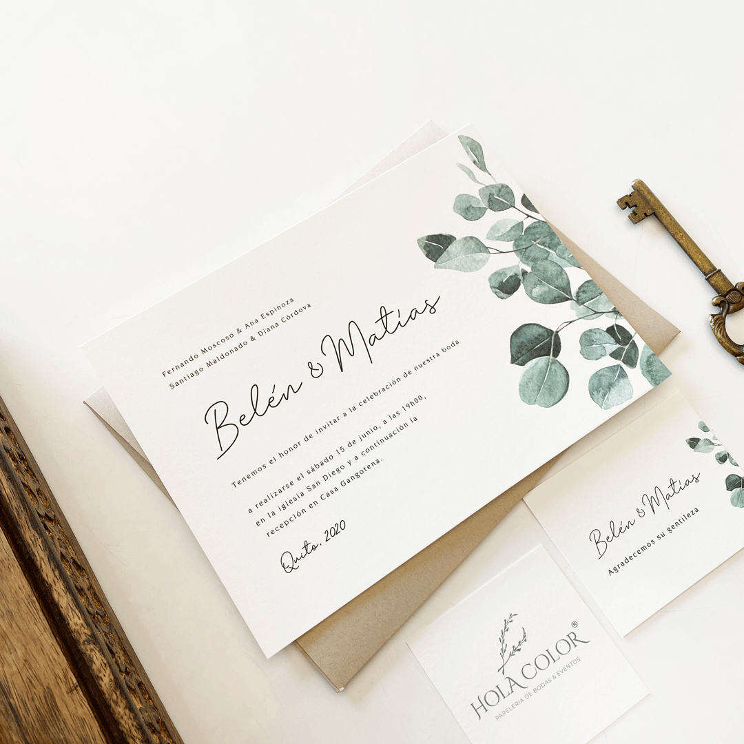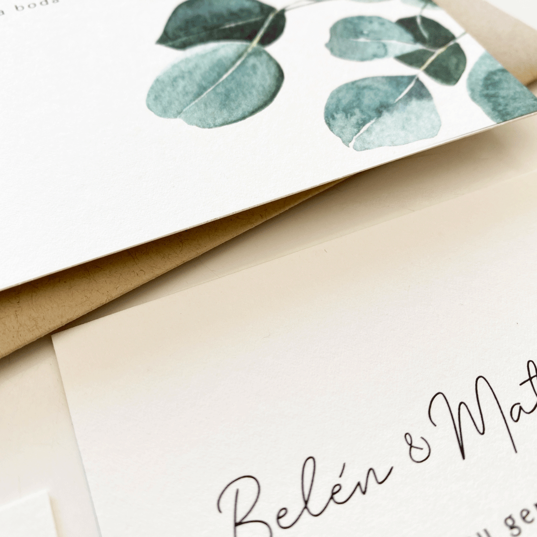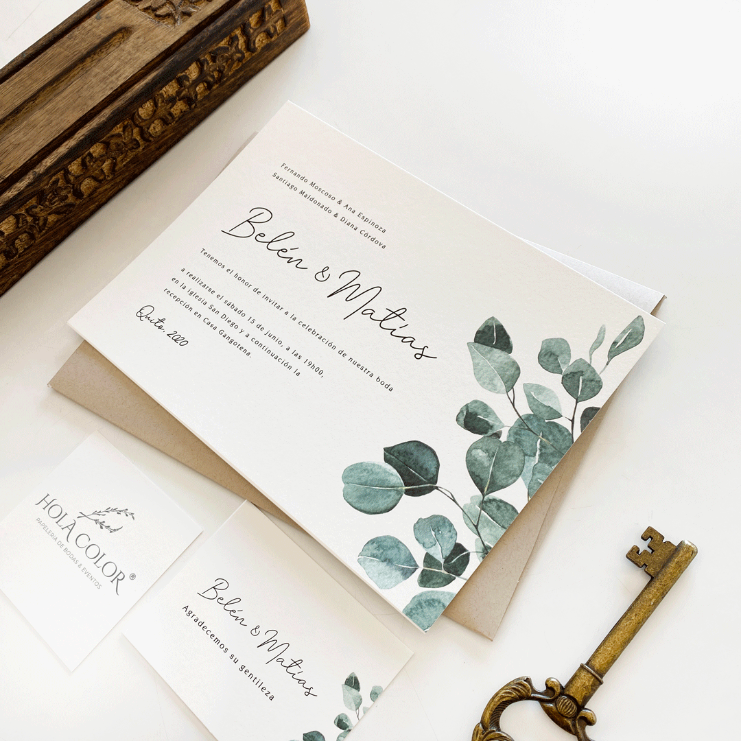 La invitación Eucalipto Imperial es minimalista como nos gusta en Hola Color, con un toque silvestre que va perfecto con una boda al aire libre en el campo.