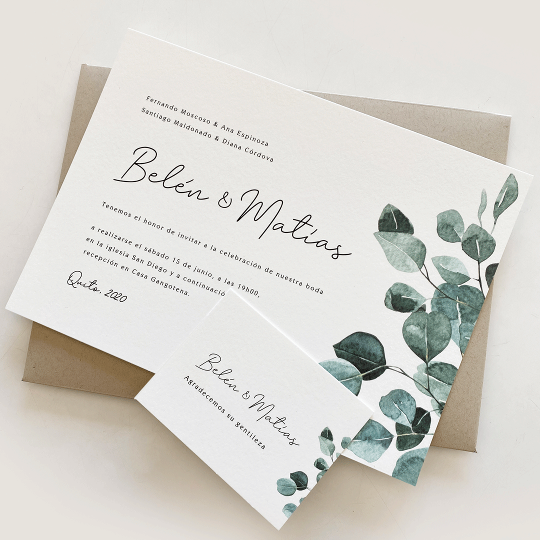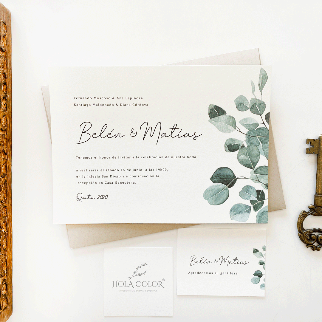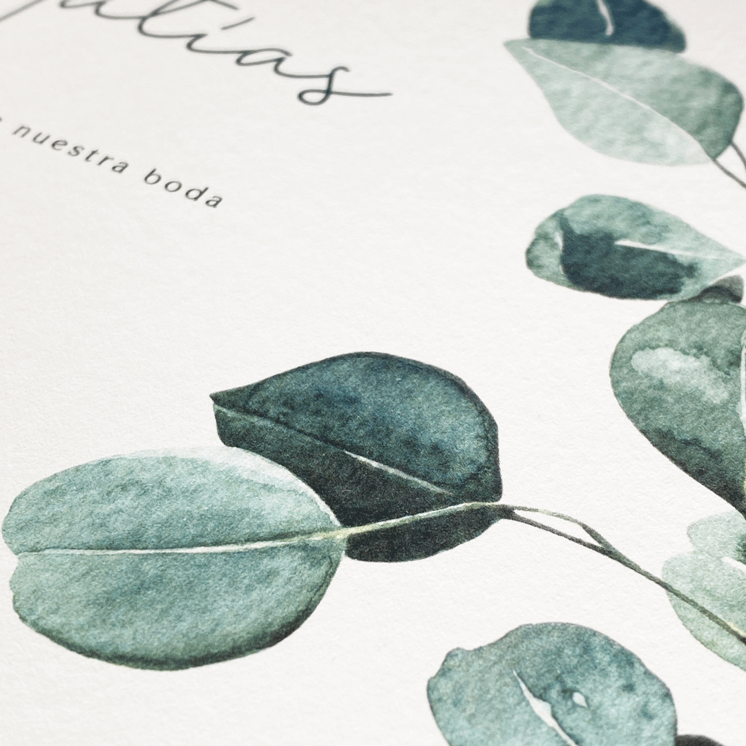La invitación Eucalipto Imperial es minimalista como nos gusta en Hola Color, con un toque silvestre que va perfecto con una boda al aire libre en el campo.
