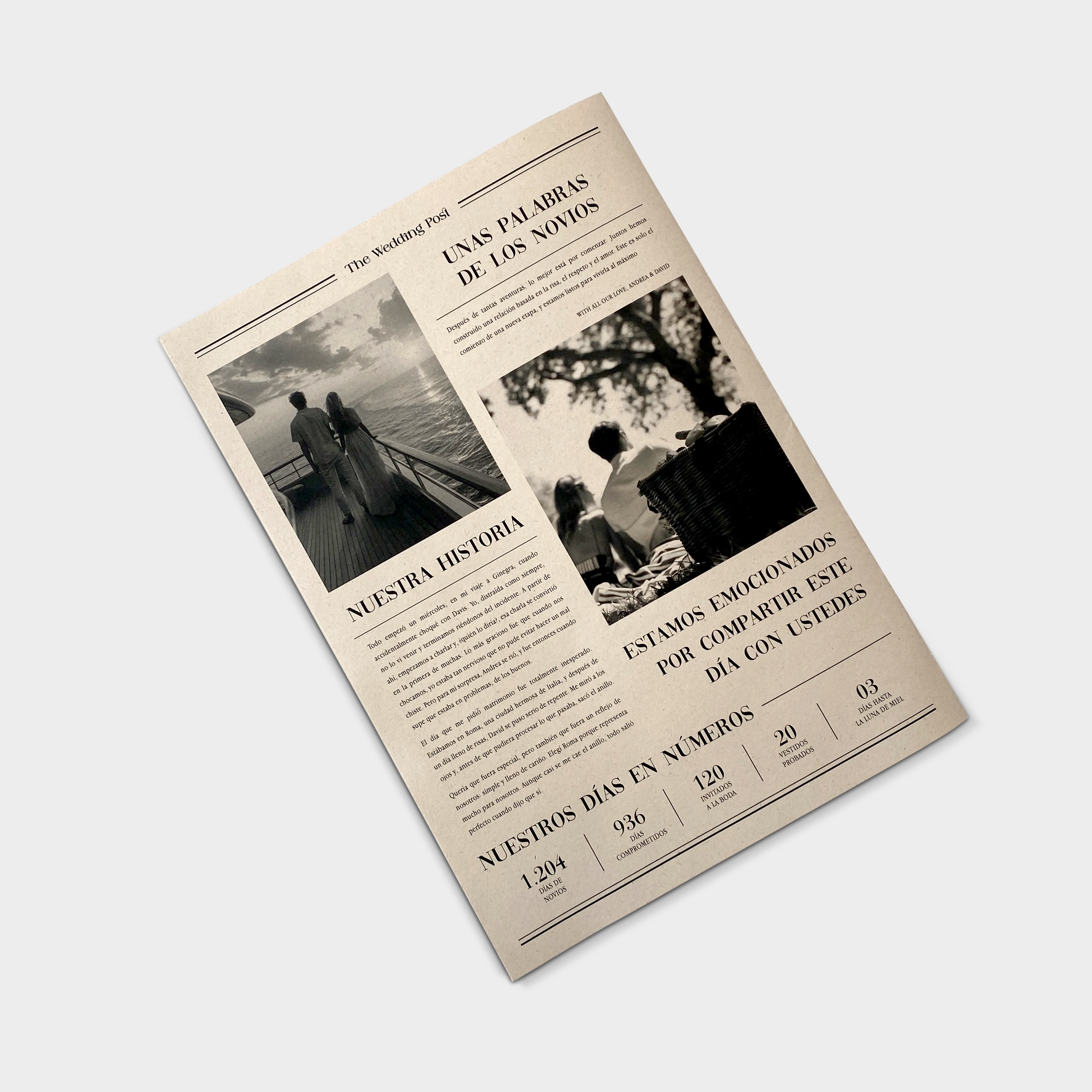 Esta invitación está diseñada en un formato único inspirado en los periódicos vintage, perfecta para quienes desean compartir su historia de amor de una manera original y memorable. Destaca por su diseño editorial clásico y elegante, ideal para capturar la atención de tus invitados.