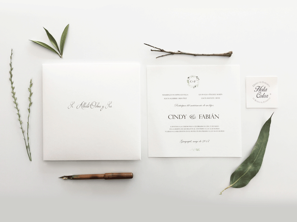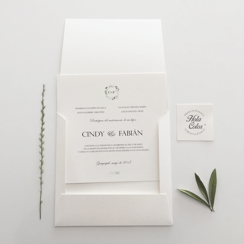 Incluye:– Sobre / 20×19,5cm- Tarjeta de invitación / 19x19cm- Tarjeta de agradecimiento / 7,5×7,5cm