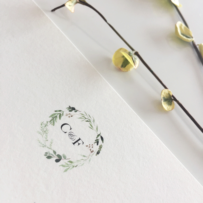 Una delicada versión de monograma botánico y diagramación estilo clásico.