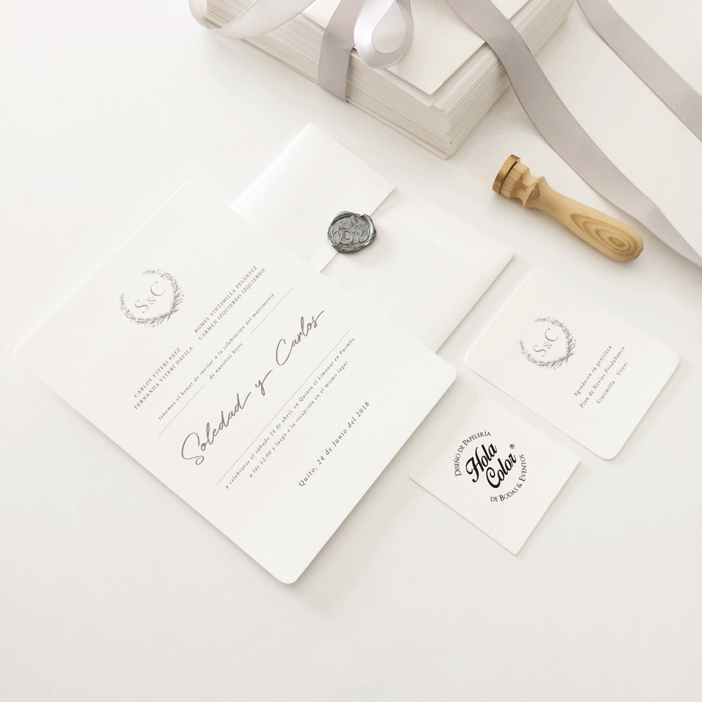 Incluye:– Sobre Imperial pestaña rectangular / 22×16,5cm– Tarjeta de invitación con bordes redondeados / 15,5×21,5cm– Tarjeta de agradecimiento / 8×10,5cm
