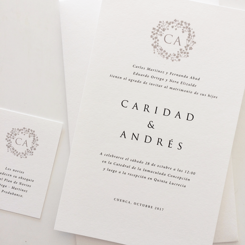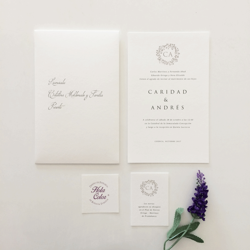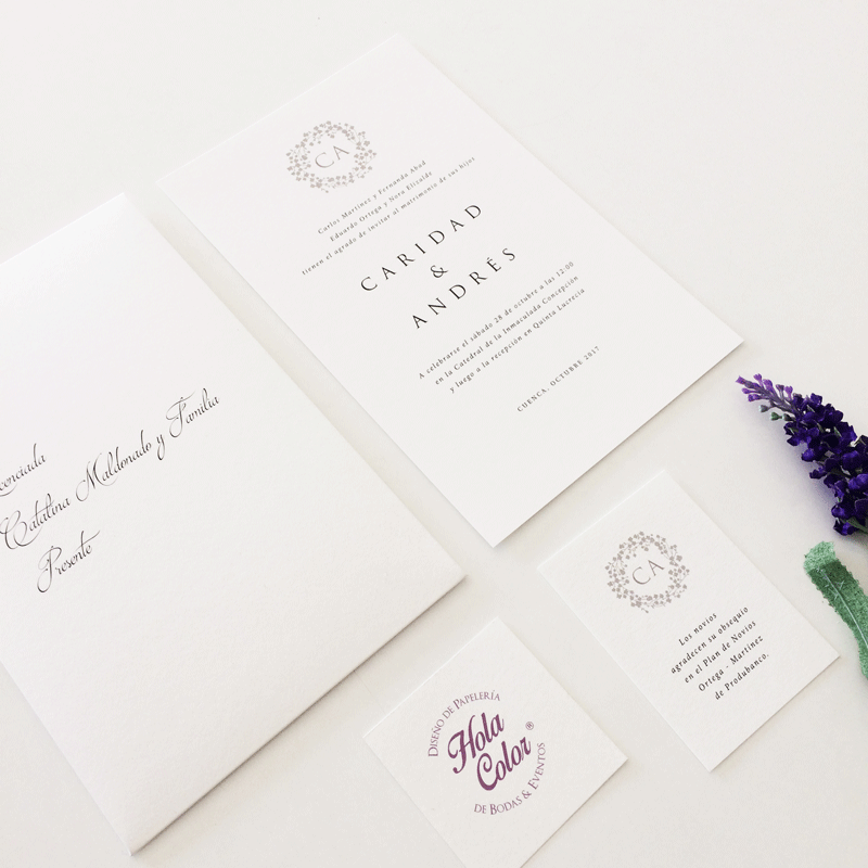 Incluye:– Sobre vertical «slim» / 23,5x15cm- Tarjeta de invitación / 22,5x14cm- Tarjeta de agradecimiento / 9×6,5cm
