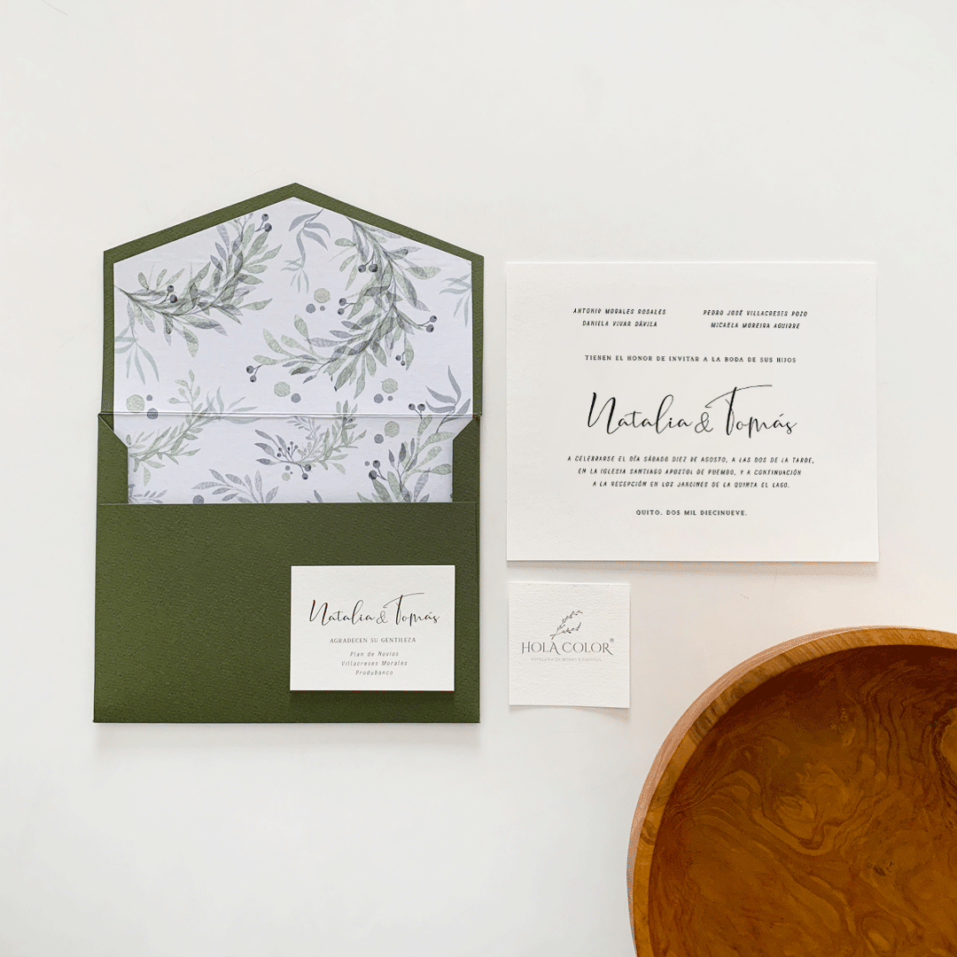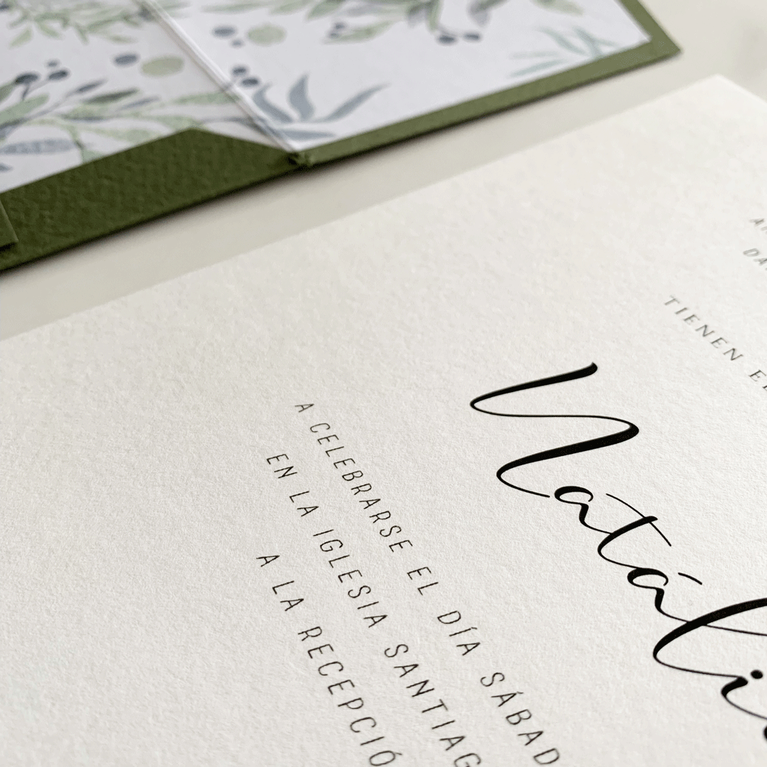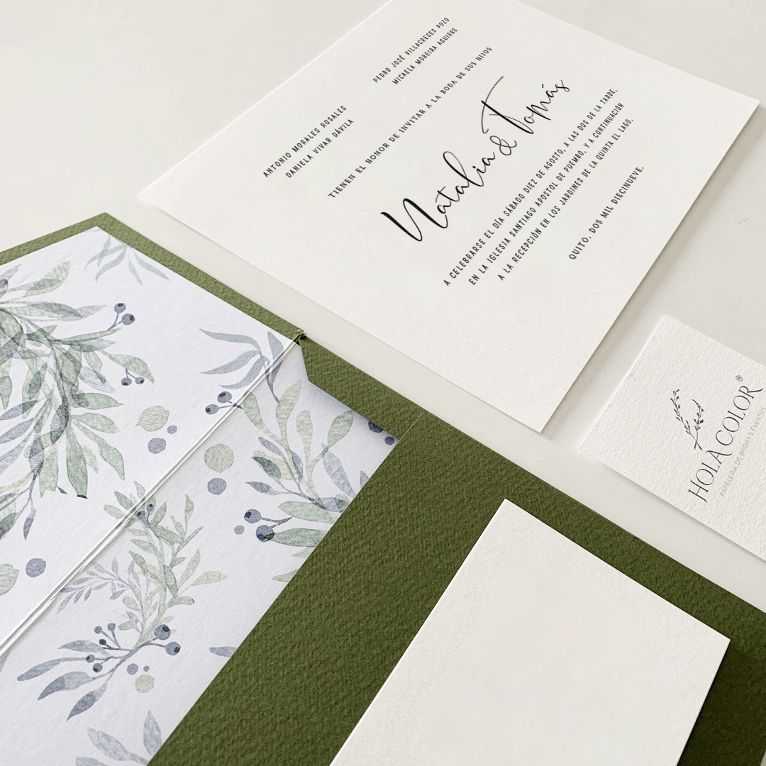 Materiales: Cartulina premium con textura suave en tono blanco crudo de 350grs.Cartulina premium texturada en tono verde olivo de 250grs.Tarjetas de asistencia o cróquis se venden por separado. Pedidos superiores a 75 unidades obtienen descuentos