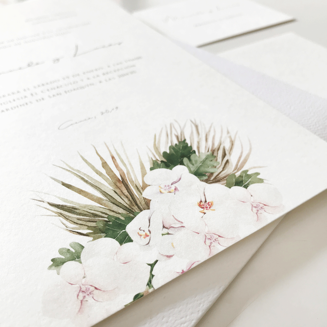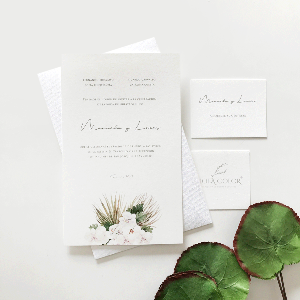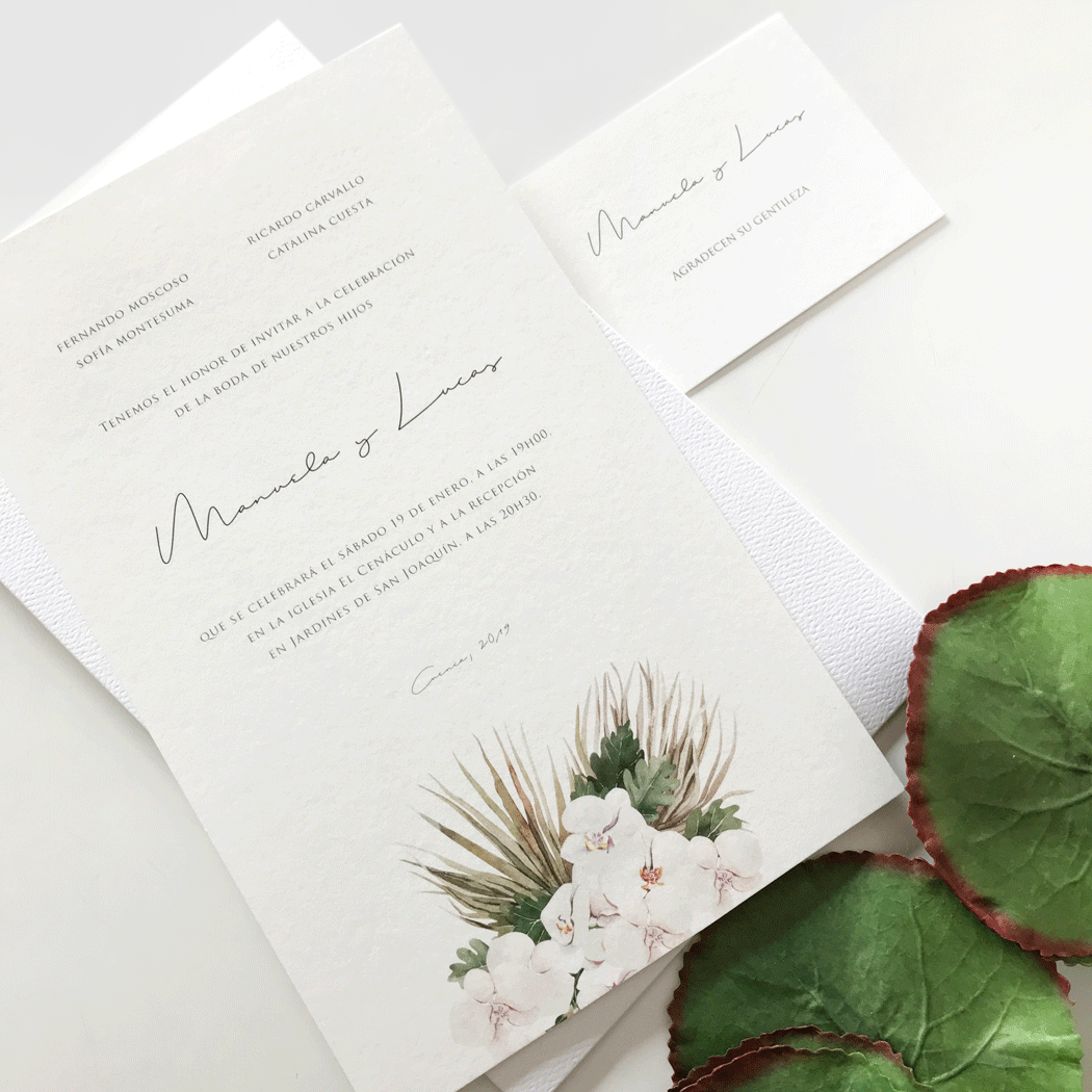 Incluye:– Sobre vertical “slim” / 23,5x15cm– Tarjeta de invitación / 22,5x14cm– Tarjeta de agradecimiento / 9×6,5cm