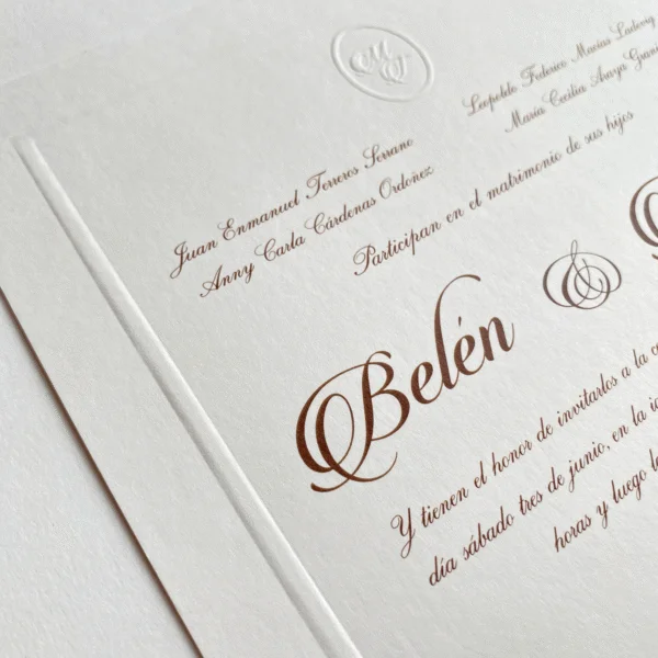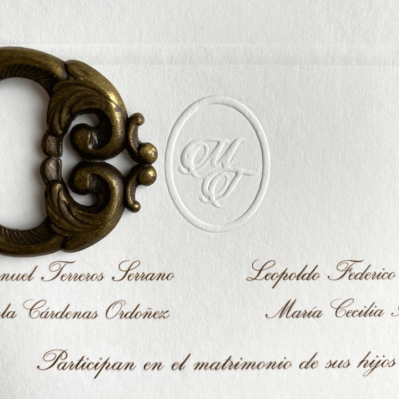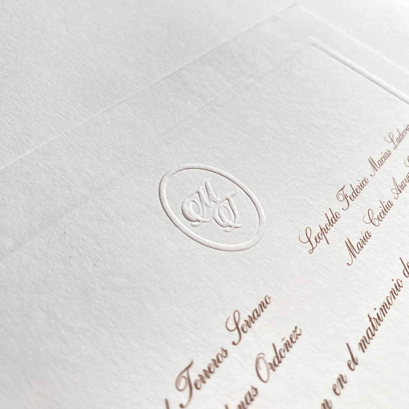 – Sobre Premium solapa larga 20×19,5cm- Tarjeta de invitación con marco seco bold / 19 x 19,5 cm.- Tarjeta de agradecimiento con marco seco bold / 7,5×7,5cm- Monograma en relieve