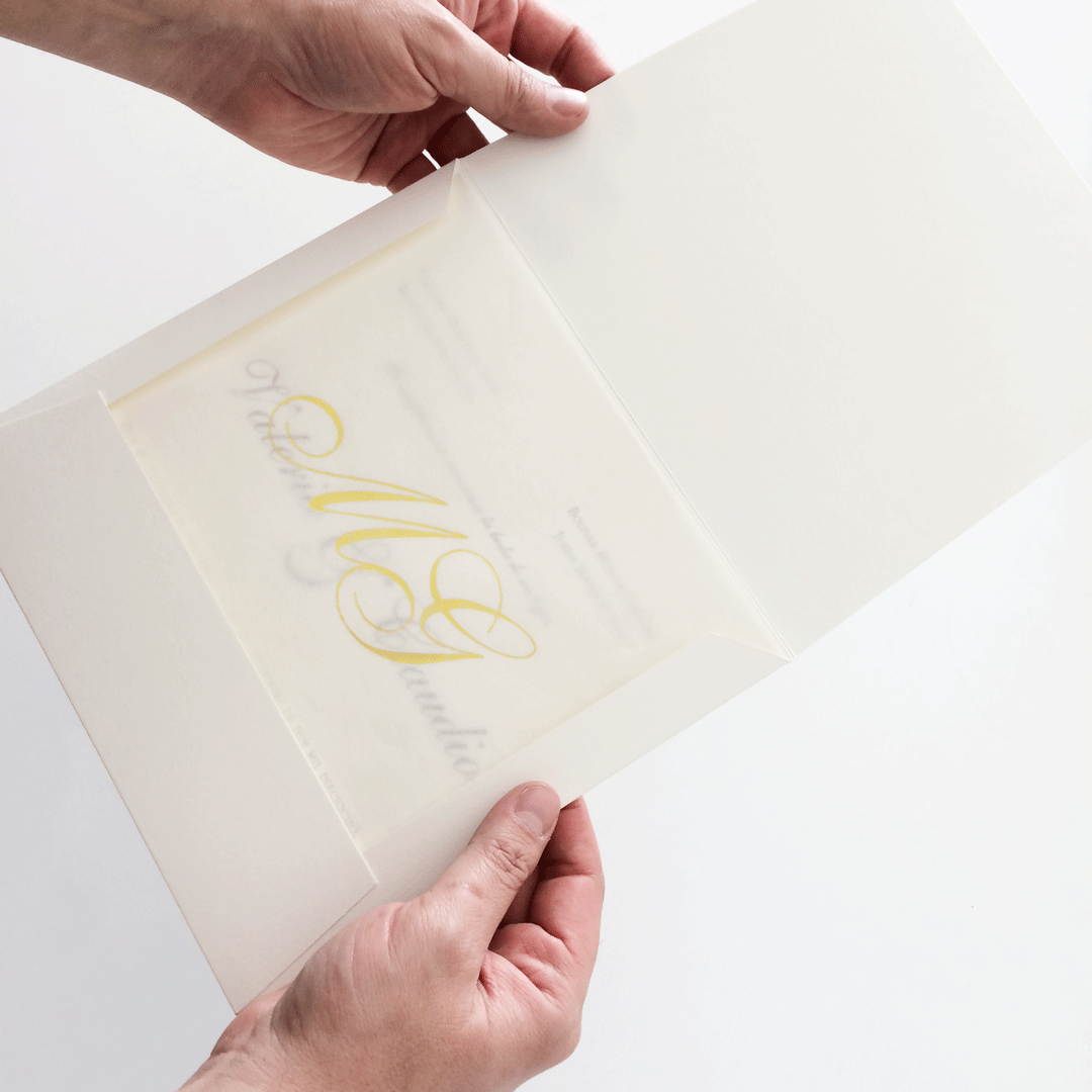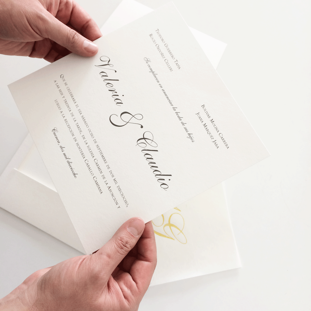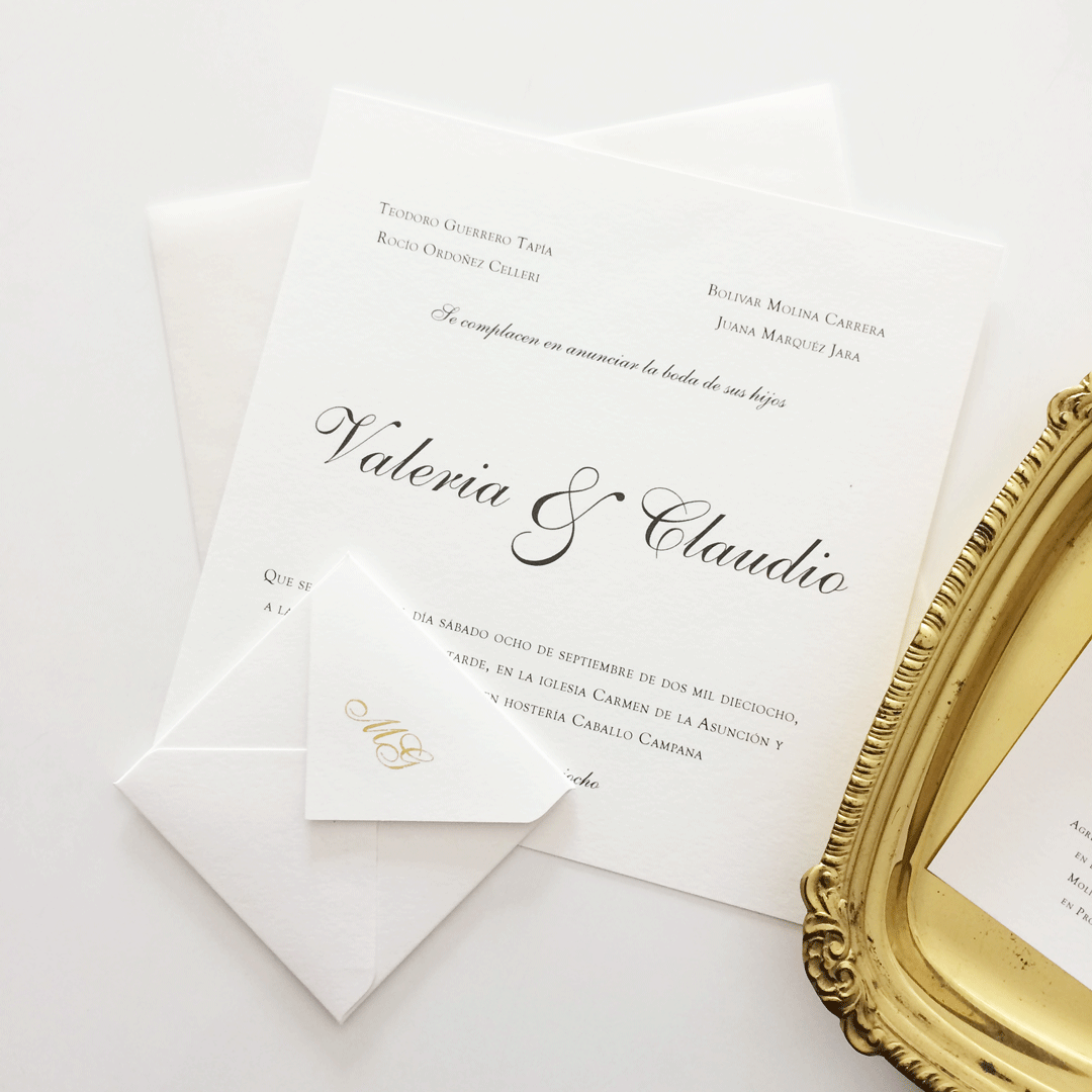 Las Invitaciones para boda «Clásica Gold» nos demuestran que hay cosas que jamás pasan de moda, un monograma clásico, en fuentes caligráficas, con el detalle en pan de oro, característico de ésta colección. Una propuesta llena de elegancia y lujo pensada para bodas de alto perfil. [bg_collapse view=»link» color=»#4a4949″ expand_text=»Leer más» collapse_text=»Mostrar menos» ] Las invitaciones para boda, son una propuesta atemporal que nunca pierde su relevancia y elegancia en el mundo de las bodas. Este modelo de invitaciones de boda, incluso ha sido adaptado a otro tipo de invitaciones; invitaciones para bautizo, invitaciones para graduación, entro otros. Esto debido precisamente a la elegancia y lujo que transmiten. El pan de oro, es opcional dentro de este modelo de invitaciones de boda, sin embargo, el concepto y estética de estas invitaciones, son perfectas para su uso, sobre todo en el sobre principal. Si deseas complementar toda tu línea de papelería con este diseño, puedes encontrar asesoría personalizada por medio de nuestro botón de Whtasapp Bodas [/bg_collapse]