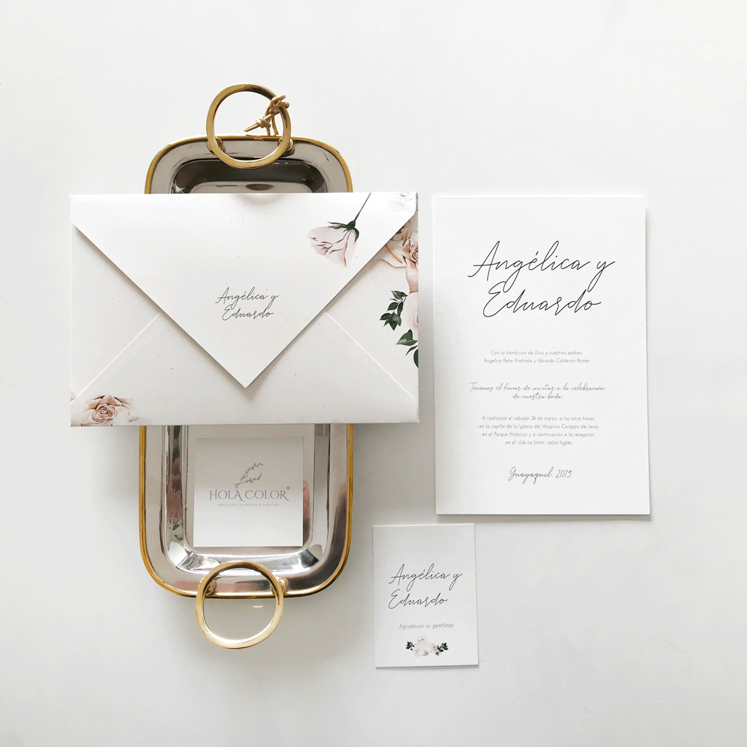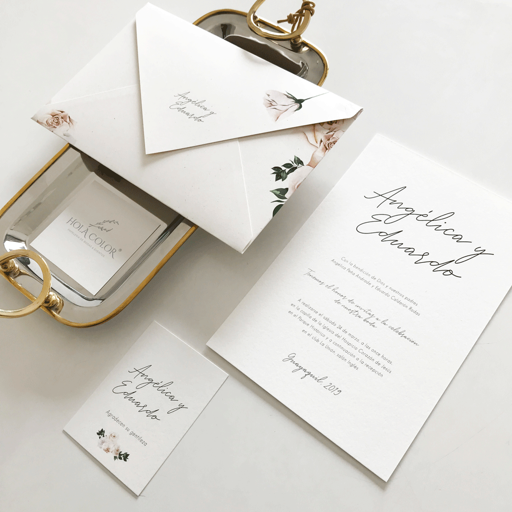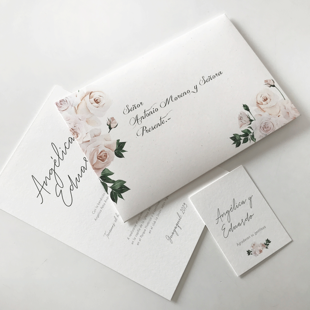 Incluye:– Sobre impreso / 22x15cm– Tarjeta de invitación / 21x14cm– Tarjeta de agradecimiento / 9x7cm