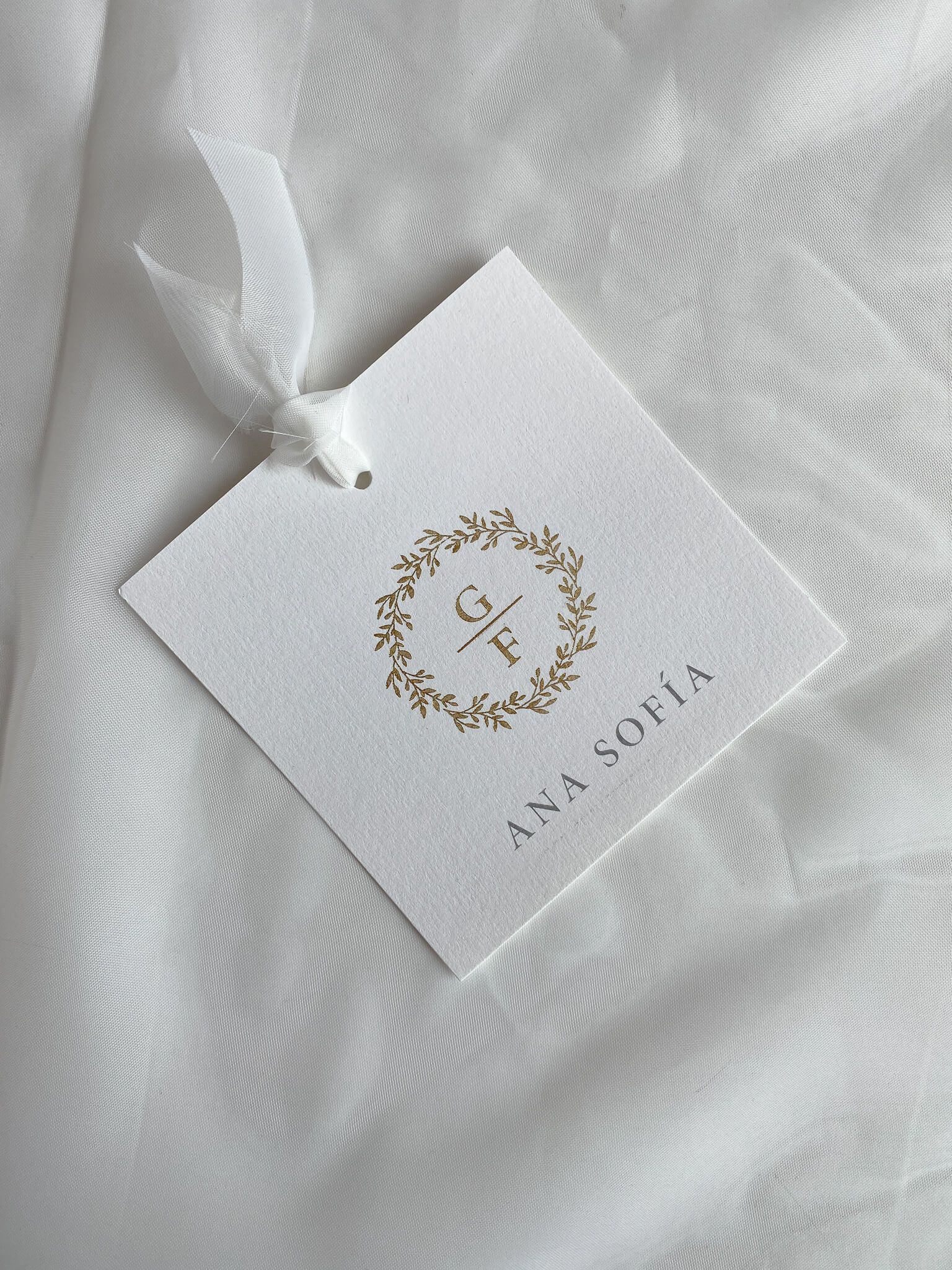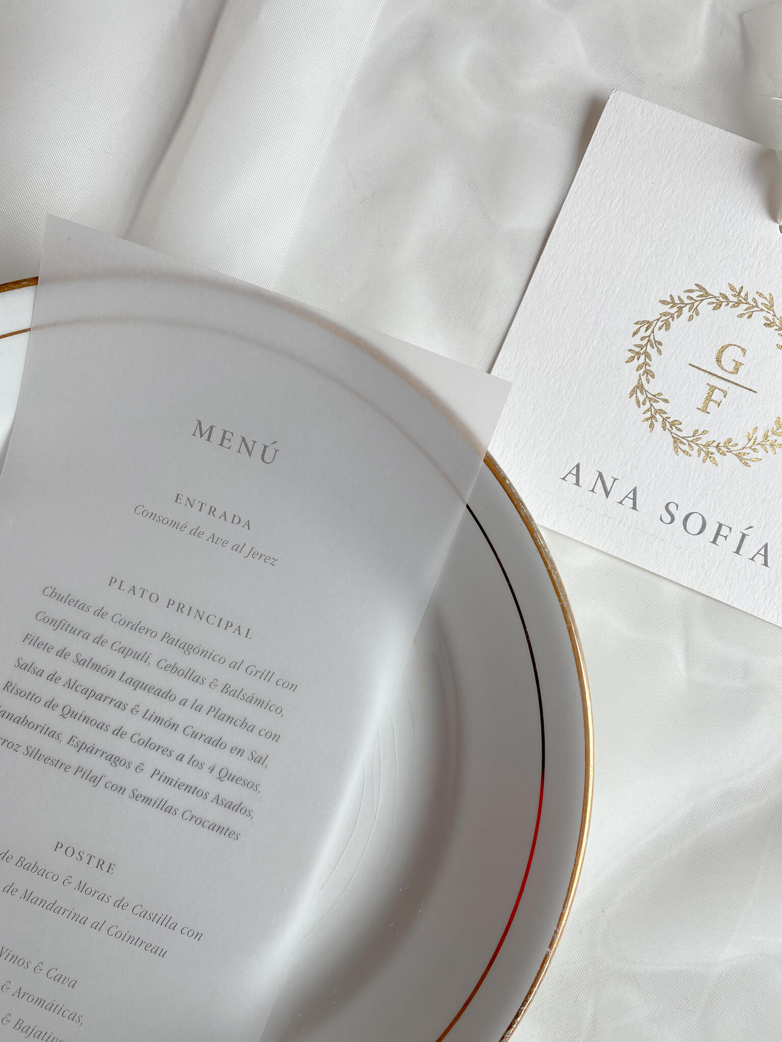Incluye: Menú impreso a un lado. Tag con monograma con cinta de tela