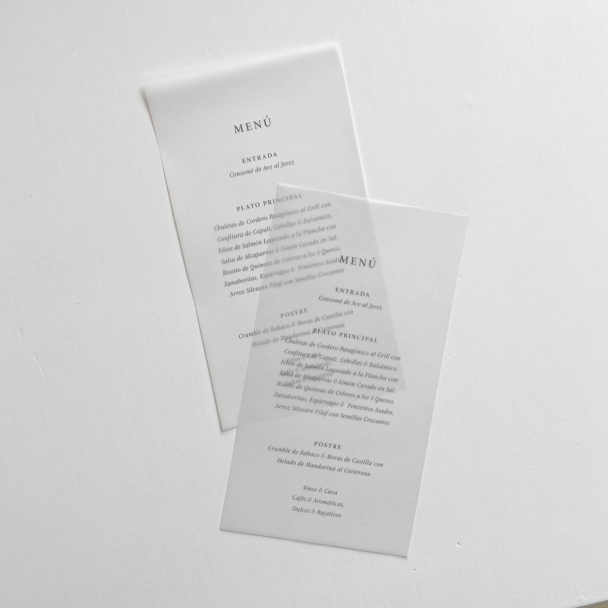 Los menús Nostalgia Gold son un detalle delicado y elegante que elevará la estética de tu mesa. La propuesta está realizada en dos piezas, el menú en papel pergamino acompañado de tag personalizado para utilizarlo como place card o con un mensaje de agradecimiento.
