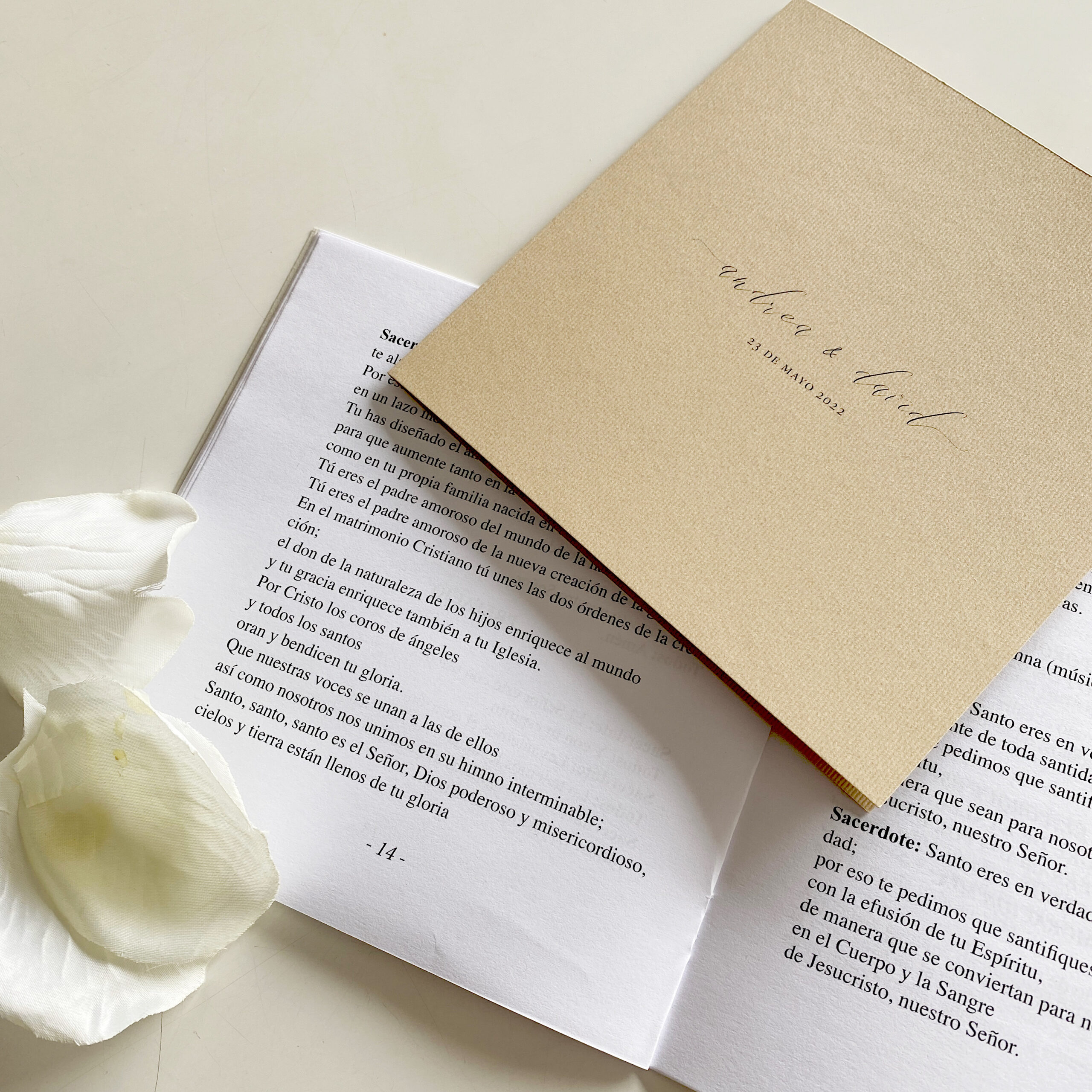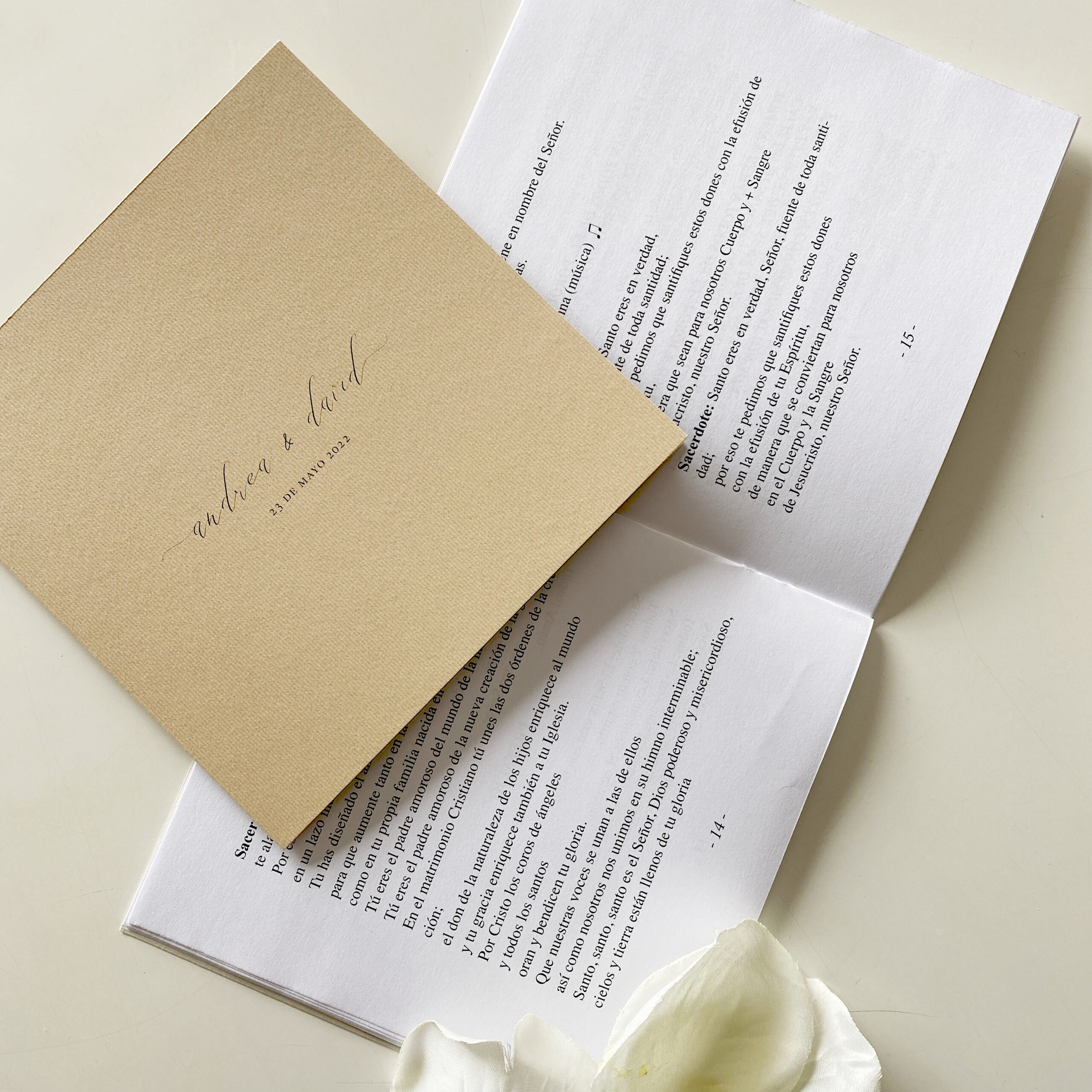 El Misal o Ceremonial se entrega a los invitados que acompañan al pacto de matrimonio, es un accesorio de papelería muy elegante y romántico que además se convierte en un recuerdo hermoso de este gran día. Si escogiste la Eucaristía como Sacramento u otro tipo de Ceremonia, este cuadernillo guarda las escrituras, textos, canciones y votos que los novios realizan.