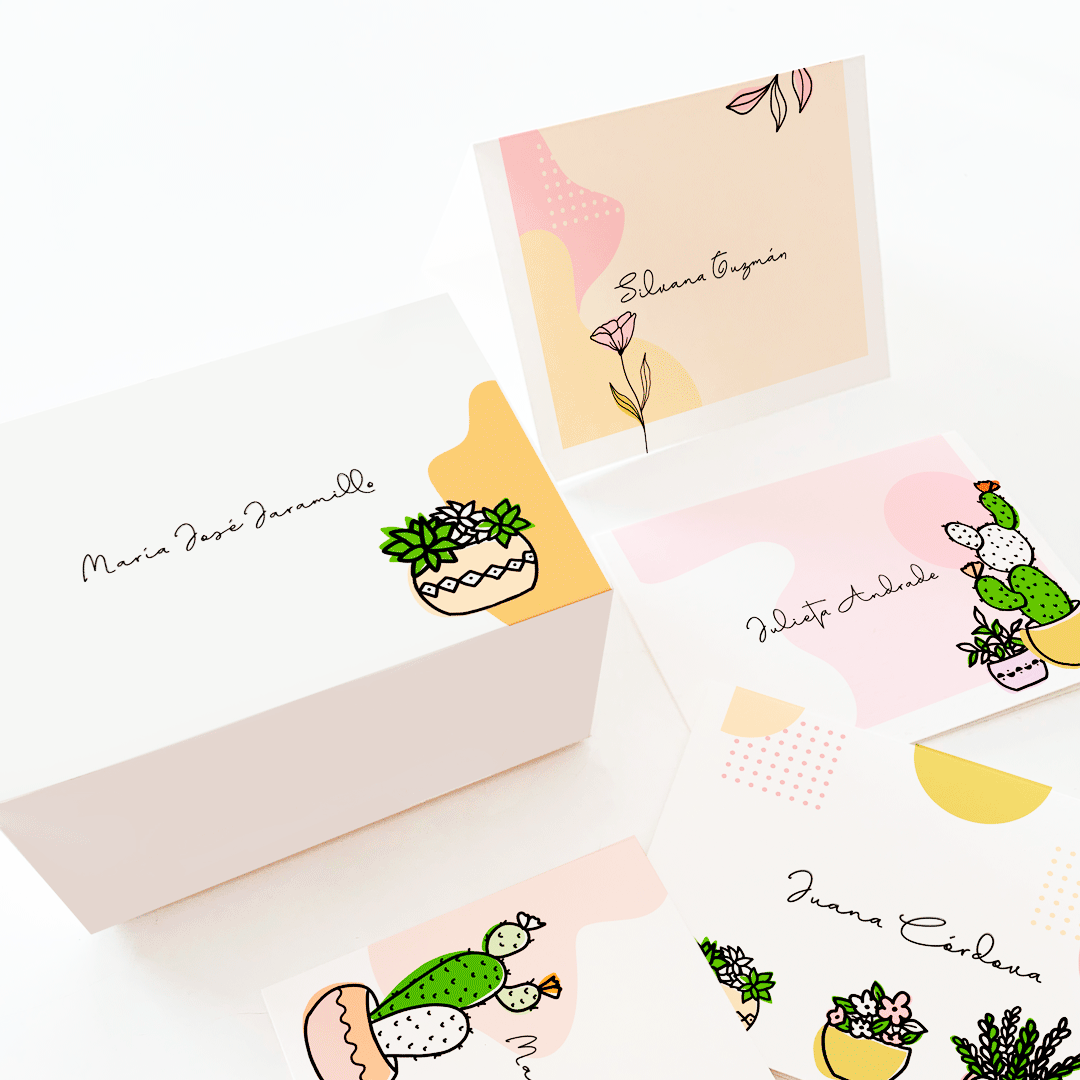 Nuestros kits de Notas Personales “Bohó” conectan con personas alegres y muy vitales, que ven el mundo a todo color; utilízalas para enviar tus regalos, agradecimientos o cualquier nota, dejando huella. Cada modelo se personaliza con tus datos.